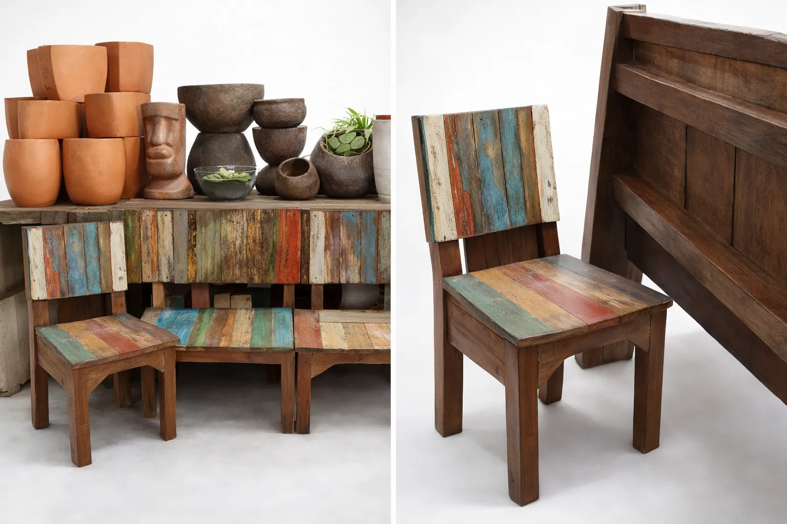 These chairs are built from authentic aged boat timber, giving each piece rich character, natural weathering, and distinctive grain patterns that cannot be replicated. The result is a strong, durable, and visually striking set of chairs that blend history with rustic design.